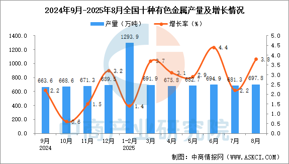 中商情報網(wǎng)訊:據(jù)中商產(chǎn)業(yè)研究院數(shù)據(jù)庫,2025年8月全國十種有色金屬當月產(chǎn)量與去年同期相比增長。2025年8月全國十種有色金屬產(chǎn)量為697.8萬噸,同比增長3.8%。2025年1-8月全國十種有色金屬產(chǎn)量5431.7萬噸,同比增長3.1%。