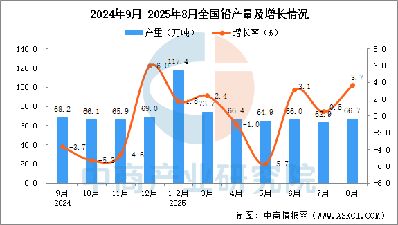 中商情報網(wǎng)訊:據(jù)中商產(chǎn)業(yè)研究院數(shù)據(jù)庫,2025年8月全國鉛當(dāng)月產(chǎn)量與去年同期相比增長。2025年8月全國鉛產(chǎn)量為66.7萬噸,同比增長3.7%。2025年1-8月全國鉛產(chǎn)量為511.6萬噸,同比增長0.9%。