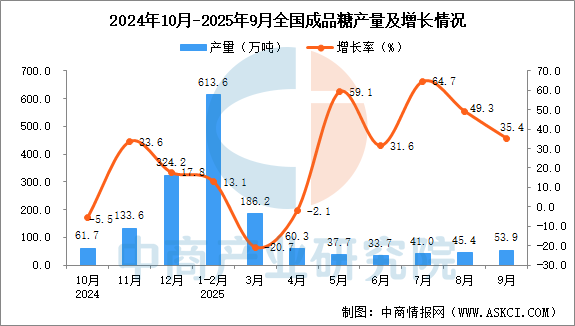 中商情報網(wǎng)訊:據(jù)中商產(chǎn)業(yè)研究院數(shù)據(jù)庫,2025年9月全國成品糖當(dāng)月產(chǎn)量與去年同期相比增長。2025年9月全國成品糖產(chǎn)量為53.9萬噸,同比增長35.4%。2025年1-9月全國成品糖產(chǎn)量1098.4萬噸,同比增長10.8%。