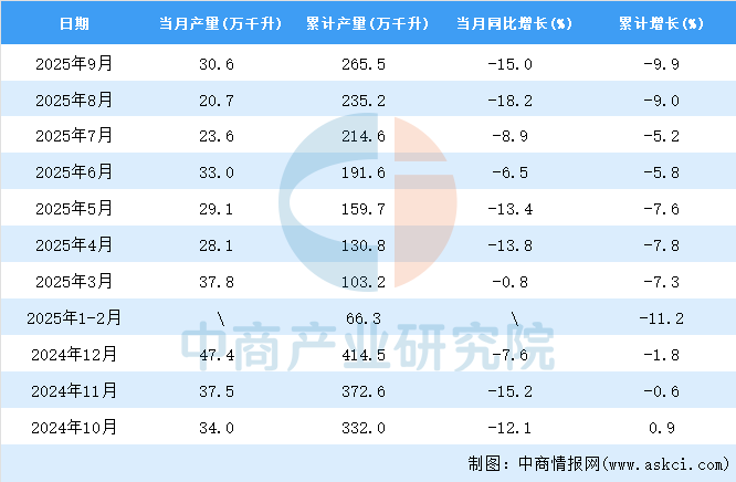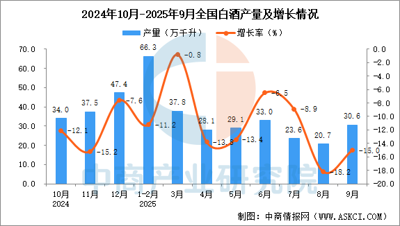 中商情報(bào)網(wǎng)訊:據(jù)中商產(chǎn)業(yè)研究院數(shù)據(jù)庫(kù)顯示,2025年9月全國(guó)白酒(折65度,商品量)當(dāng)月產(chǎn)量與去年同期相比下降。2025年9月全國(guó)白酒產(chǎn)量為30.6萬(wàn)千升,同比下降15.0%。2025年1-9月全國(guó)白酒產(chǎn)量265.5萬(wàn)千升,同比下降9.9%。