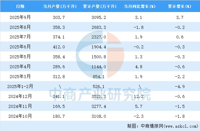 中商情報(bào)網(wǎng)訊:據(jù)中商產(chǎn)業(yè)研究院數(shù)據(jù)庫顯示,2025年9月全國啤酒當(dāng)月產(chǎn)量與去年同期相比增長。2025年9月全國啤酒產(chǎn)量為303.7萬千升,同比增長3.1%。2025年1-9月全國啤酒產(chǎn)量3095.2萬千升,同比增長3.7%。