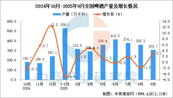 2025年9月全國啤酒產(chǎn)量增長情況: