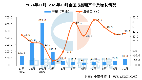 中商情報(bào)網(wǎng)訊:據(jù)中商產(chǎn)業(yè)研究院數(shù)據(jù)庫,2025年10月全國成品糖當(dāng)月產(chǎn)量與去年同期相比增長。2025年10月全國成品糖產(chǎn)量為88.3萬噸,同比增長36.1%。2025年1-10月全國成品糖產(chǎn)量1139.9萬噸,同比增長7.8%。