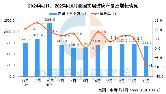 中商情報網(wǎng)訊:據(jù)中商產(chǎn)業(yè)研究院數(shù)據(jù)庫,2025年10月全國夾層玻璃當(dāng)月產(chǎn)量與去年同期相比下降。2025年10月全國夾層玻璃產(chǎn)量為1344.2萬平方米,同比下降9.1%。2025年1-10月全國夾層玻璃產(chǎn)量13423.0萬平方米,同比增長4.6%。