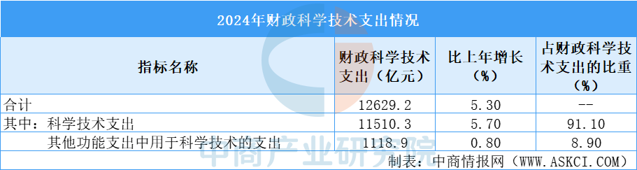 2024年,國(guó)家財(cái)政科學(xué)技術(shù)支出12629.2億元,比上年增加633.3億元,增長(zhǎng)5.3%。其中,中央財(cái)政科技支出4192.5億元,占全國(guó)財(cái)政科技支出的比重為33.2%;地方財(cái)政科技支出8436.7億元,占比為66.8%。