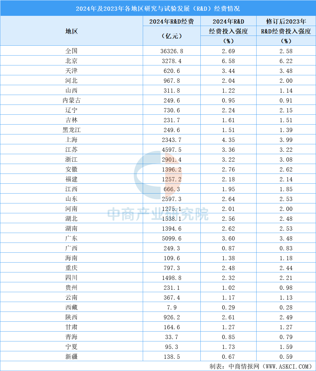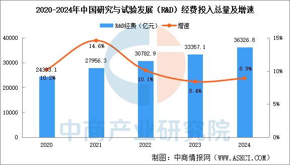 2024年,全國(guó)共投入研究與試驗(yàn)發(fā)展(R&D)經(jīng)費(fèi)36326.8億元,比上年增加2969.7億元,增長(zhǎng)8.9%;研究與試驗(yàn)發(fā)展(R&D)經(jīng)費(fèi)投入強(qiáng)度(與國(guó)內(nèi)生產(chǎn)總值之比)為2.69%,比上年提高0.11個(gè)百分點(diǎn)。按研究與試驗(yàn)發(fā)展(R&D)人員全時(shí)工作量計(jì)算的人均經(jīng)費(fèi)為48.0萬(wàn)元,比上年增加1.9萬(wàn)元。