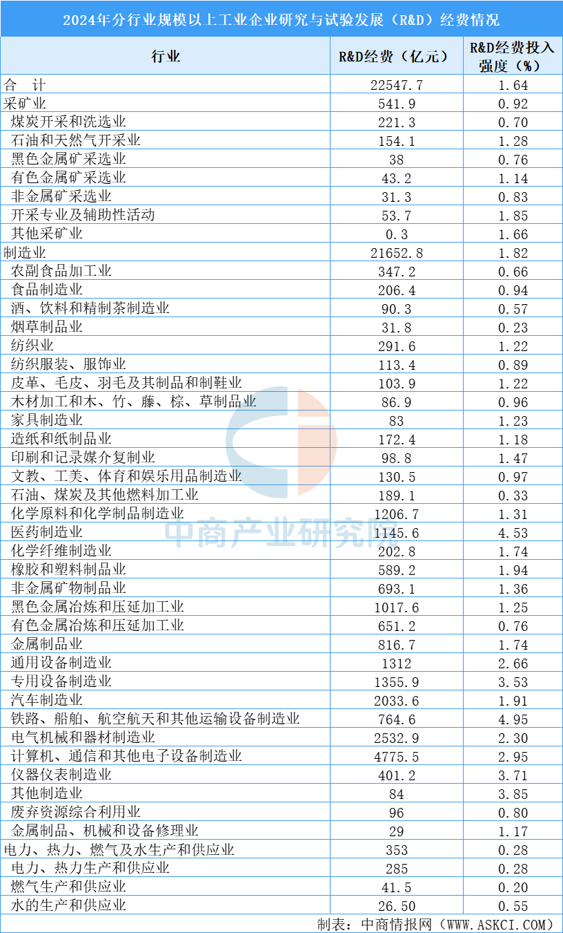 分產(chǎn)業(yè)部門看,規(guī)模以上高技術(shù)制造業(yè)研究與試驗(yàn)發(fā)展(R&D)經(jīng)費(fèi)7668.9億元,比上年增長(zhǎng)10.2%;投入強(qiáng)度(與營(yíng)業(yè)收入之比)為3.35%,比上年提高0.24個(gè)百分點(diǎn)。在規(guī)模以上工業(yè)企業(yè)中,研究與試驗(yàn)發(fā)展(R&D)經(jīng)費(fèi)投入超過(guò)千億元的行業(yè)大類有8個(gè),比上年增加1個(gè),這8個(gè)行業(yè)的經(jīng)費(fèi)占全部規(guī)模以上工業(yè)企業(yè)研究與試驗(yàn)發(fā)展(R&D)經(jīng)費(fèi)的比重為68.2%。