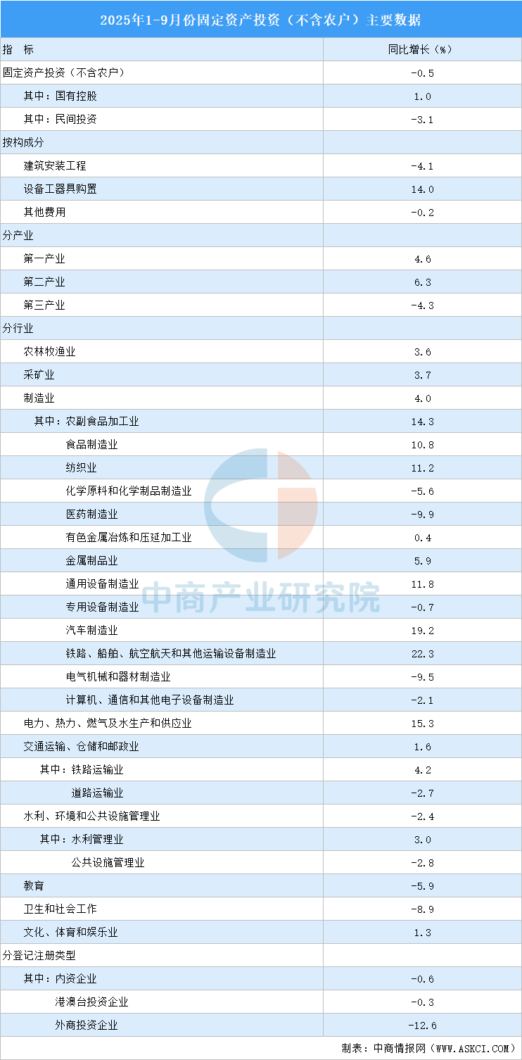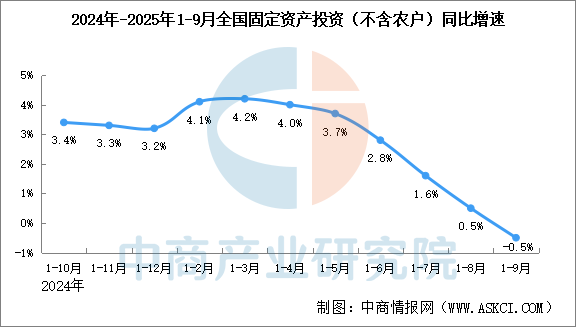中商情報(bào)網(wǎng)訊:2025年1-9月份,全國(guó)固定資產(chǎn)投資(不含農(nóng)戶)371535億元,同比下降0.5%(按可比口徑計(jì)算)。其中,民間固定資產(chǎn)投資同比下降3.1%。從環(huán)比看,9月份固定資產(chǎn)投資(不含農(nóng)戶)下降0.07%。