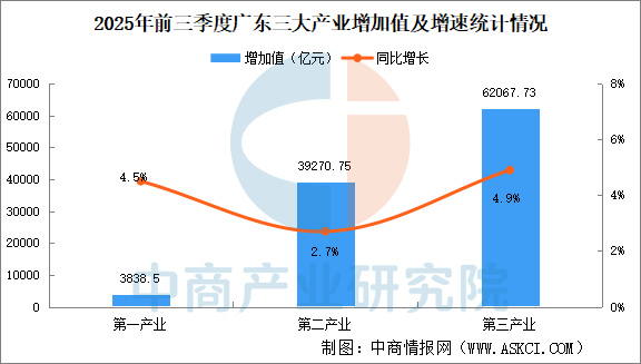 中商情報(bào)網(wǎng)訊:前三季度,廣東經(jīng)濟(jì)運(yùn)行總體保持穩(wěn)定。但也要看到,當(dāng)前外部環(huán)境更趨復(fù)雜嚴(yán)峻,國(guó)內(nèi)有效需求不足,經(jīng)濟(jì)持續(xù)回升向好基礎(chǔ)仍需加力鞏固。根據(jù)地區(qū)生產(chǎn)總值統(tǒng)一核算結(jié)果,前三季度,廣東實(shí)現(xiàn)地區(qū)生產(chǎn)總值105176.98億元,按不變價(jià)格計(jì)算,同比增長(zhǎng)4.1%。其中,第一產(chǎn)業(yè)增加值3838.50億元,增長(zhǎng)4.5%;第二產(chǎn)業(yè)增加值39270.75億元,增長(zhǎng)2.7%;第三產(chǎn)業(yè)增加值62067.73億元,增長(zhǎng)4.9%。