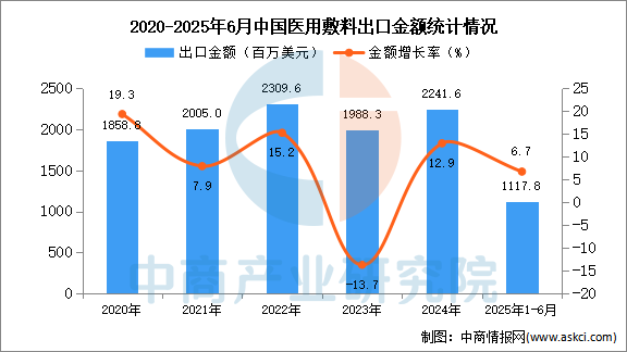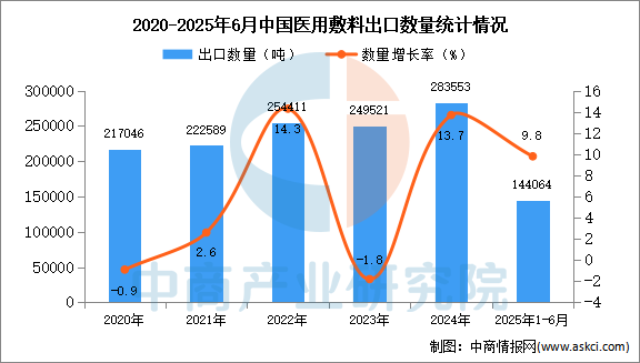 2025年6月中國醫(yī)用敷料出口量及金額增長(zhǎng)情況