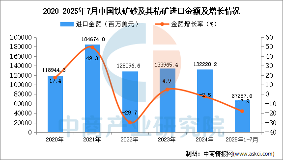 2025年7月中國鐵礦砂及其精礦進口量及金額增長情況