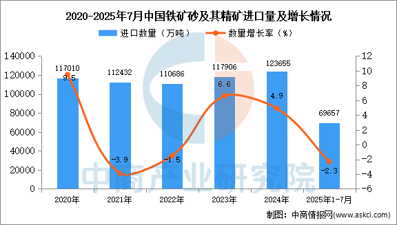 2025年1-7月中國鐵礦砂及其精礦進口數(shù)據(jù)統(tǒng)計分析:進口量同比下降2.3%