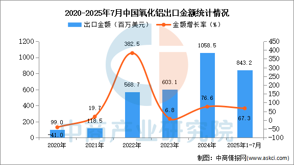 從金額方面來(lái)看,數(shù)據(jù)顯示,2025年1-7月中國(guó)氧化鋁出口金額843.2百萬(wàn)美元,同比增長(zhǎng)67.3%。