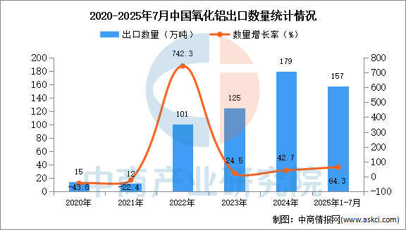 中商情報(bào)網(wǎng)訊:據(jù)中商產(chǎn)業(yè)研究院數(shù)據(jù)庫(kù)顯示,2024年我國(guó)氧化鋁出口量179噸,同比增長(zhǎng)42.7%。最新數(shù)據(jù)顯示,2025年1-7月中國(guó)氧化鋁出口量157噸,同比增長(zhǎng)64.3%。
