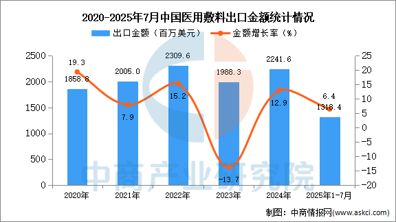 從金額方面來看,數(shù)據(jù)顯示,2025年1-7月中國醫(yī)用敷料出口金額1318.4百萬美元,同比增長6.4%。