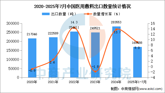 2025年7月中國醫(yī)用敷料出口量及金額增長情況