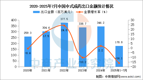 從金額方面來(lái)看,數(shù)據(jù)顯示,2025年1-7月中國(guó)中式成藥出口金額178.8百萬(wàn)美元,同比下降16.1%。