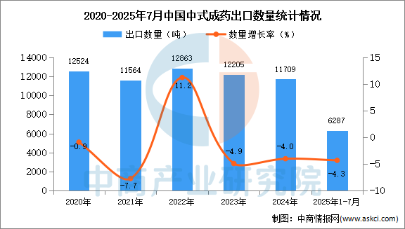 中商情報(bào)網(wǎng)訊:據(jù)中商產(chǎn)業(yè)研究院數(shù)據(jù)庫(kù)顯示,2024年我國(guó)中式成藥出口量11709噸,同比下降4%。最新數(shù)據(jù)顯示,2025年1-7月中國(guó)中式成藥出口量6287噸,同比下降4.3%。