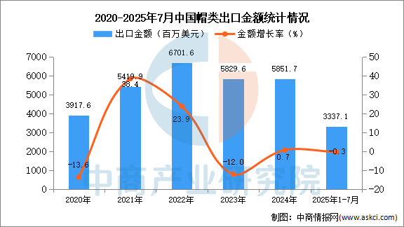 從金額方面來看,數(shù)據(jù)顯示,2025年1-7月中國帽類出口金額3337.1百萬美元,同比下降0.3%。