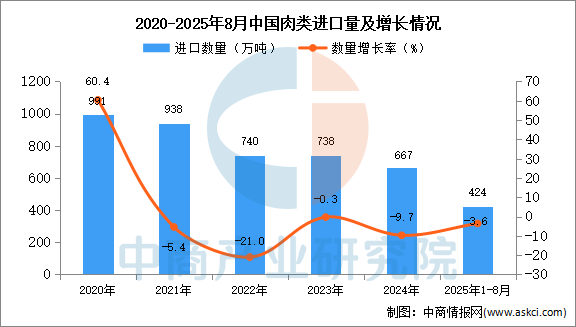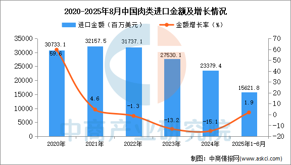 2025年8月中國肉類(包括雜碎)進口量及金額增長情況