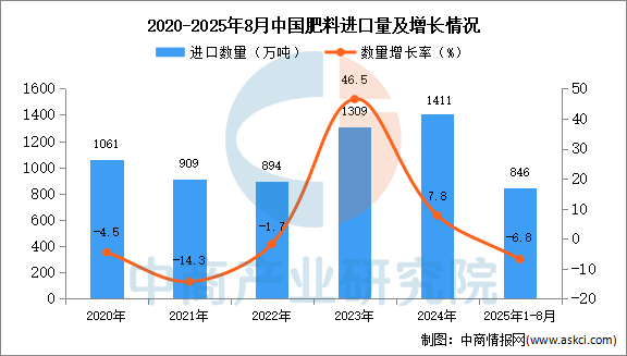 中商情報網(wǎng)訊:據(jù)中商產(chǎn)業(yè)研究院數(shù)據(jù)庫顯示,2024年中國肥料進(jìn)口量1411萬噸,同比增長7.8%。最新數(shù)據(jù)顯示,2025年1-8月我國肥料累計進(jìn)口量846萬噸,同比下降6.8%。