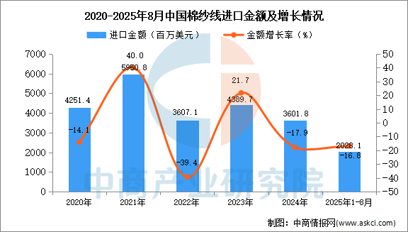 2025年8月中國(guó)棉紗線進(jìn)口量及金額增長(zhǎng)情況