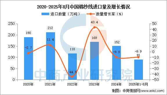 2025年1-8月中國(guó)棉紗線進(jìn)口數(shù)據(jù)統(tǒng)計(jì)分析:進(jìn)口量91萬(wàn)噸