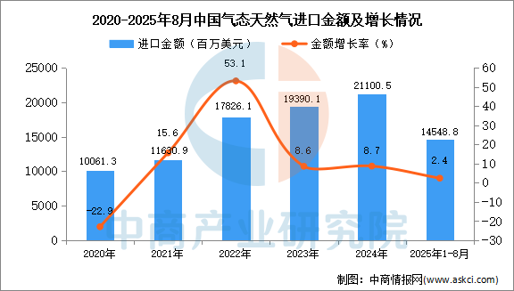 2025年8月中國氣態(tài)天然氣進口量及金額增長情況