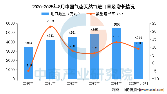 中商情報網(wǎng)訊:據(jù)中商產(chǎn)業(yè)研究院數(shù)據(jù)庫顯示,2024年中國氣態(tài)天然氣進口量5504萬噸,同比增長13.1%。最新數(shù)據(jù)顯示,2025年1-8月中國氣態(tài)天然氣進口量4014萬噸,同比增長9%。