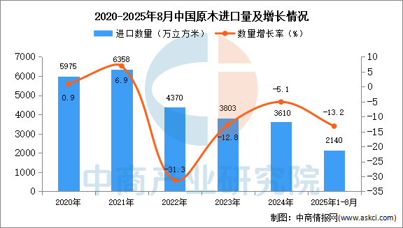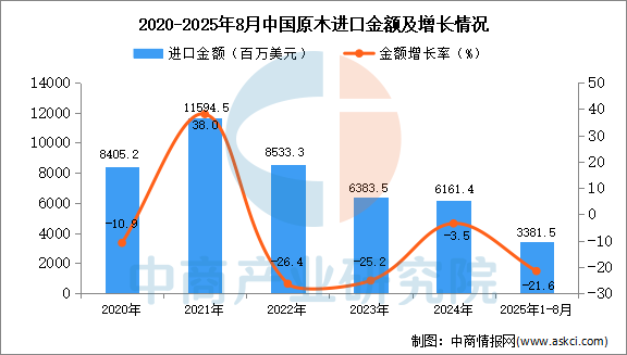 2025年8月中國(guó)原木進(jìn)口量及金額增長(zhǎng)情況