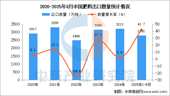 中商情報(bào)網(wǎng)訊:據(jù)中商產(chǎn)業(yè)研究院數(shù)據(jù)庫顯示,2024年我國肥料出口量3213萬噸,同比增長2%。最新數(shù)據(jù)顯示,2025年1-8月中國肥料出口量2792萬噸,同比增長41.7%。