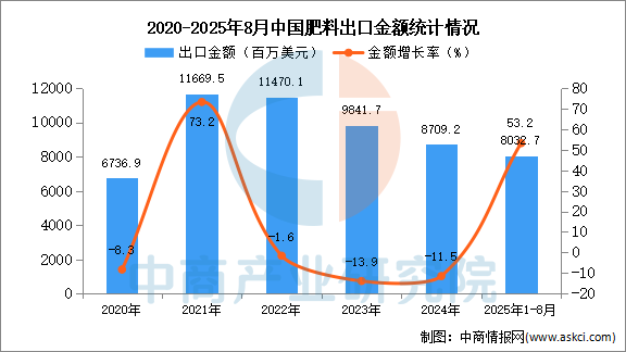 從金額方面來看,數(shù)據(jù)顯示,2025年1-8月中國肥料出口金額8032.7百萬美元,同比增長53.2%。