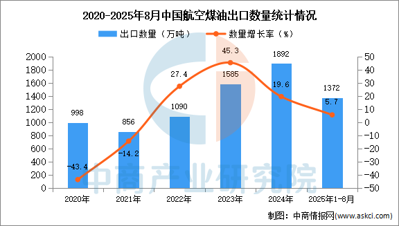 中商情報網(wǎng)訊:據(jù)中商產(chǎn)業(yè)研究院數(shù)據(jù)庫顯示,2024年我國航空煤油的出口量1892萬噸,同比增長19.6%。最新數(shù)據(jù)顯示,2025年1-8月中國航空煤油出口量1372萬噸,同比增長5.7%。