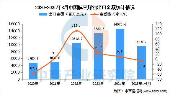 從金額方面來看,數(shù)據(jù)顯示,2025年1-8月中國航空煤油出口金額9559.7百萬美元,同比下降6.9%。