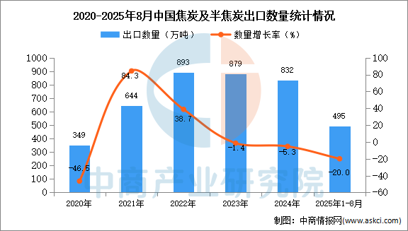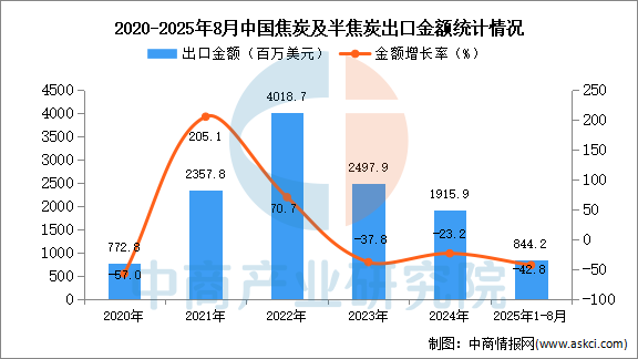 2025年8月中國(guó)焦炭及半焦炭出口量及金額增長(zhǎng)情況