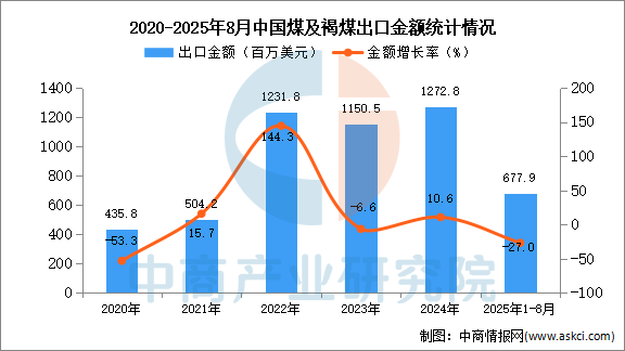 從金額方面來看,數(shù)據(jù)顯示,2025年1-8月中國煤及褐煤出口金額677.9百萬美元,同比下降27%。
