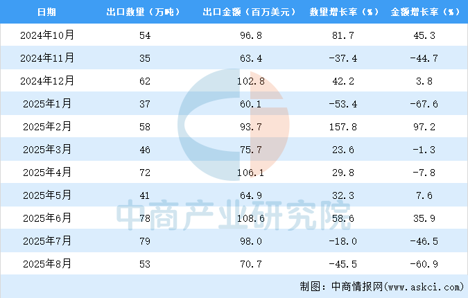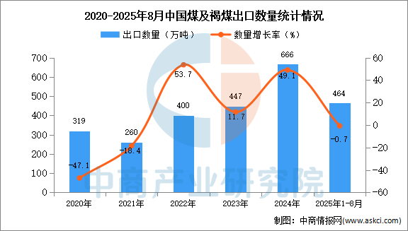 2025年8月中國煤及褐煤出口量及金額增長情況