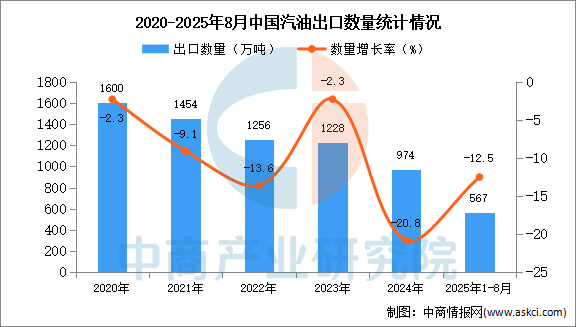 中商情報網(wǎng)訊:據(jù)中商產(chǎn)業(yè)研究院數(shù)據(jù)庫顯示,2024年我國汽油出口量974萬噸,同比下降20.8。最新數(shù)據(jù)顯示,2025年1-8月中國汽油出口量567萬噸,同比下降12.5%。
