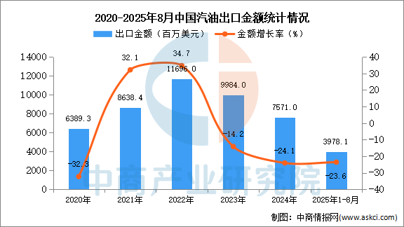 2025年8月中國汽油出口量及金額增長情況