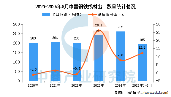 中商情報(bào)網(wǎng)訊:據(jù)中商產(chǎn)業(yè)研究院數(shù)據(jù)庫(kù)顯示,2024年中國(guó)鋼鐵線材出口量262萬(wàn)噸,同比增長(zhǎng)7.8%。最新數(shù)據(jù)顯示,2025年1-8月中國(guó)鋼鐵線材出口量195萬(wàn)噸,同比增長(zhǎng)12.1%。