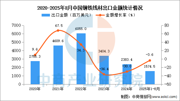 2025年8月中國(guó)鋼鐵線材出口量及金額增長(zhǎng)情況
