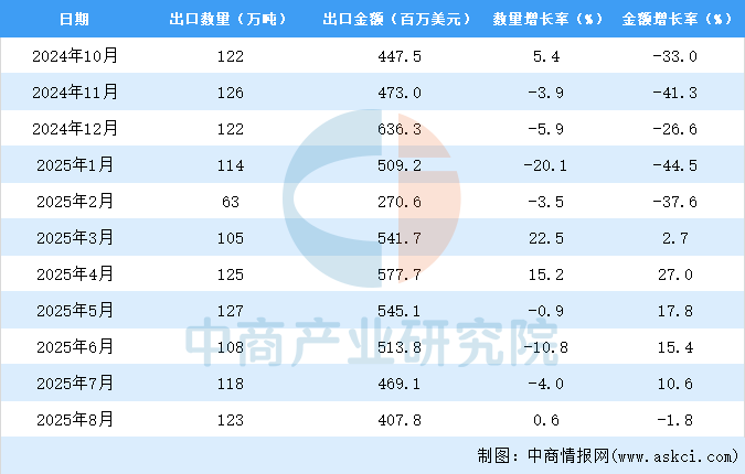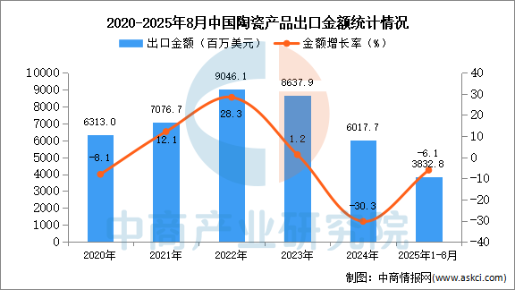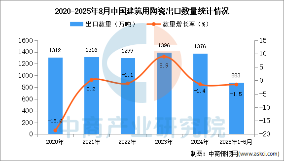 2025年8月中國建筑用陶瓷出口量及金額增長情況