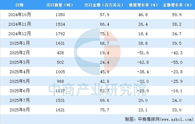 2025年8月中國(guó)鎢品出口量及金額增長(zhǎng)情況