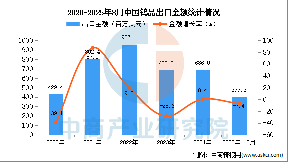 從金額方面來(lái)看,數(shù)據(jù)顯示,2025年1-8月中國(guó)鎢品出口金額399.3百萬(wàn)美元,同比下降7.4%。