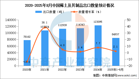 中商情報網(wǎng)訊:據(jù)中商產(chǎn)業(yè)研究院數(shù)據(jù)庫顯示,2024年我國稀土及其制品出口量123095噸,同比增長7.7%。最新數(shù)據(jù)顯示,2025年1-8月中國稀土及其制品出口量84937噸,同比增長2.1%。