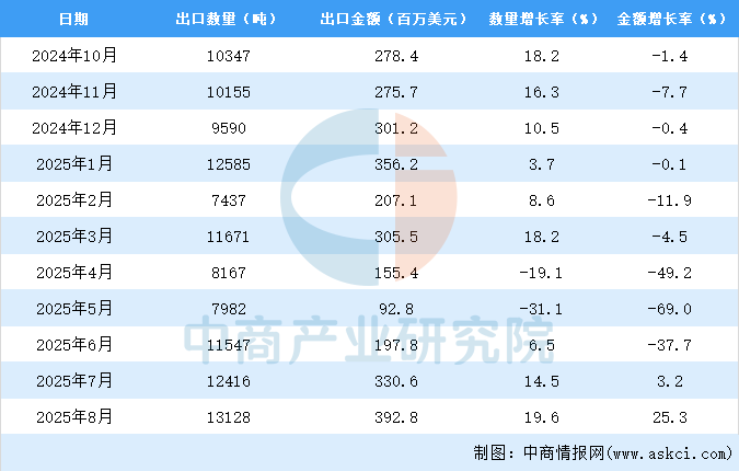 2025年8月中國稀土及其制品出口量及金額增長情況