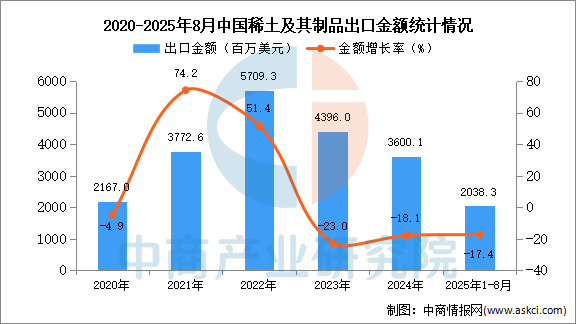 從金額方面來看,數(shù)據(jù)顯示,2025年1-8月中國稀土及其制品出口金額2038.3百萬美元,同比下降17.4%。