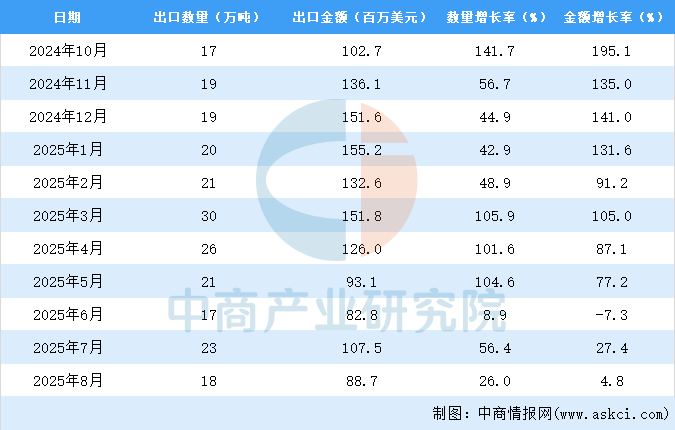 從金額方面來看,數(shù)據(jù)顯示,2025年1-8月中國氧化鋁出口金額932百萬美元,同比增長58.3%。