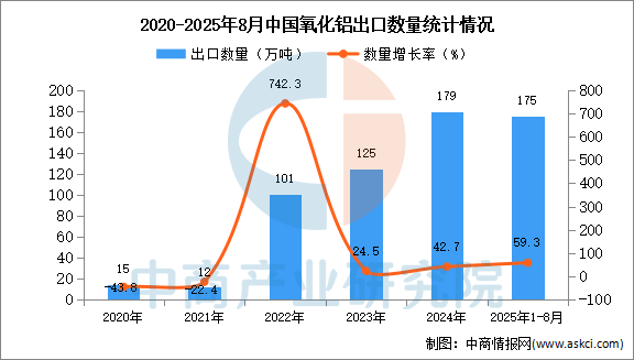 中商情報(bào)網(wǎng)訊:據(jù)中商產(chǎn)業(yè)研究院數(shù)據(jù)庫顯示,2024年我國氧化鋁出口量179噸,同比增長42.7%。最新數(shù)據(jù)顯示,2025年1-8月中國氧化鋁出口量175噸,同比增長59.3%。