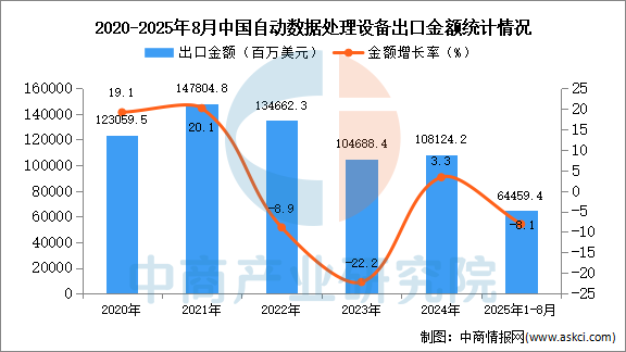 從金額方面來(lái)看,數(shù)據(jù)顯示,2025年1-8月中國(guó)自動(dòng)數(shù)據(jù)處理設(shè)備出口金額64459.4百萬(wàn)美元,同比下降8.1%。